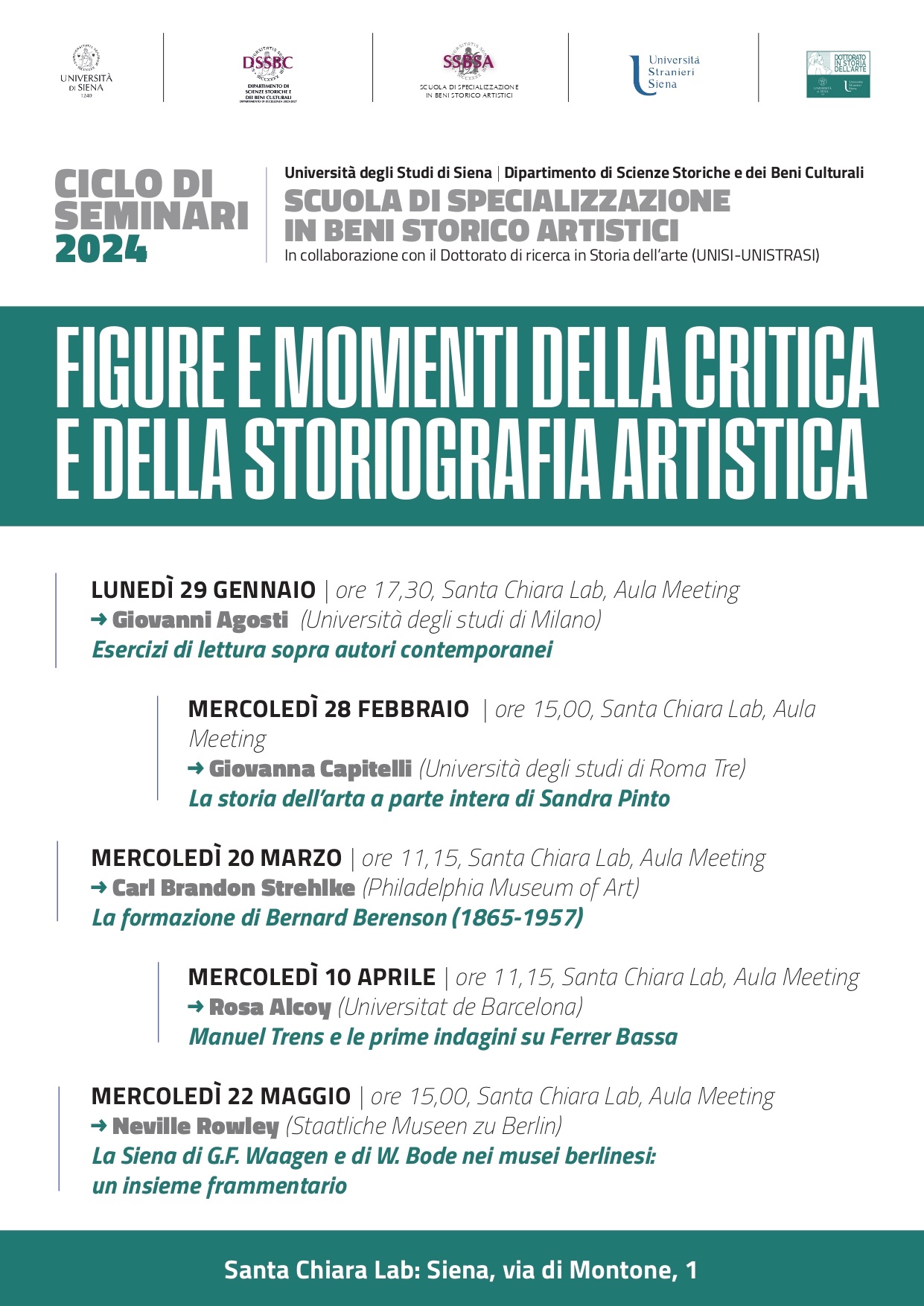 Al via la quarta edizione del ciclo di seminari "Figure e momenti della critica e della storiografia artistica", organizzato dalla Scuola di Specializzazione in Beni Storico Artistici in collaborazione con il Dottorato di ricerca in Storia dell'arte dell'Università degli Studi di Siena e dell'Università per stranieri di Siena. Si inizia lunedì 29 gennaio, alle ore 17.30 in Aula Meeting (Santa Chiara Lab, via di Valmontone, 1) con Giovanni Agosti, Università degli Studi di Milano, con un intervento su Longhi e Briganti.