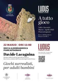 Nell’ambito del programma di talk e incontri “A tutto gioco” organizzati in occasione della mostra “Ludus. La maschera e la vertigine”, a cura di Alessandro Bellucci (Piancastagnaio, Siena, Rocca Aldobrandesca, 6 dicembre 2024-30 aprile 2025), sabato 22 marzo alle ore 11.00, il Prof. Davide Lacagnina, Direttore della Scuola di Specializzazione in Beni Storico Artistici dell’Università di Siena, terrà una conferenza dal titolo “Giochi surrealisti, per adulti bambini” (piazza Castello, 1).